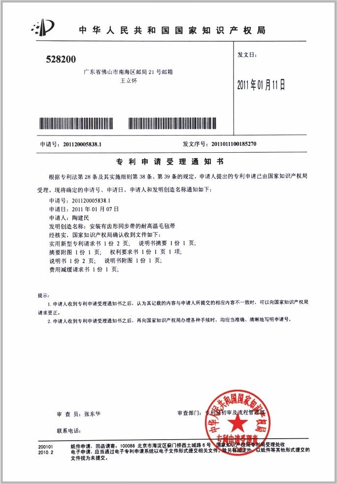 专利申请受理通知书